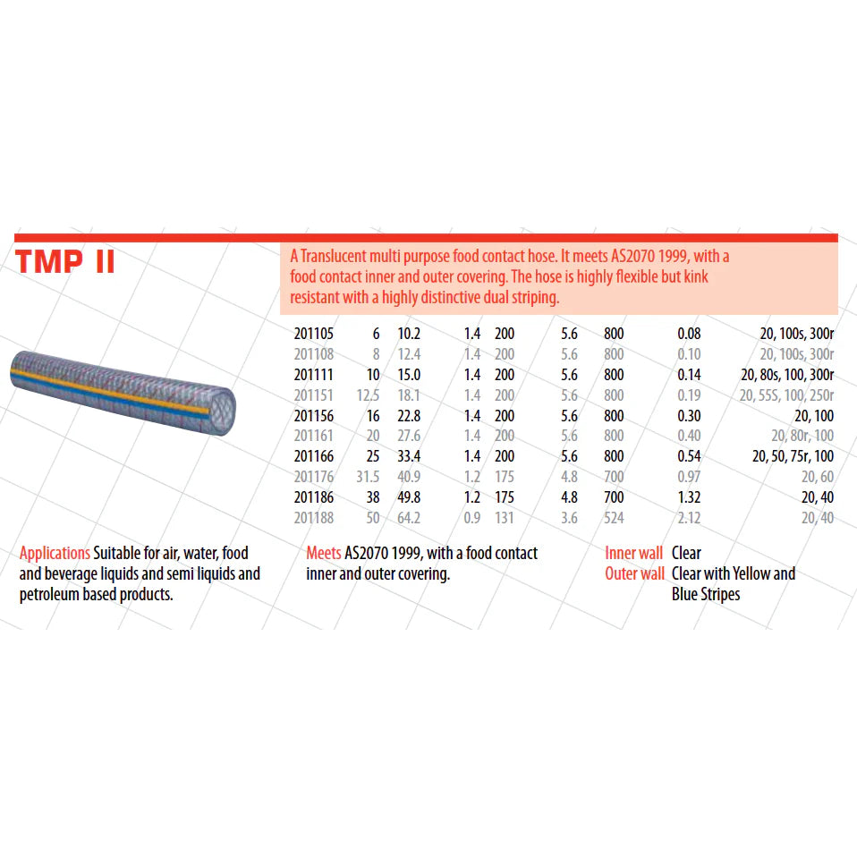 Barfell TMP II hose is a Translucent multi purpose food contact hose. It meets AS2070 1999, with a food contact inner and outer covering. The hose is highly flexible but kink resistant with a highly distinctive dual striping